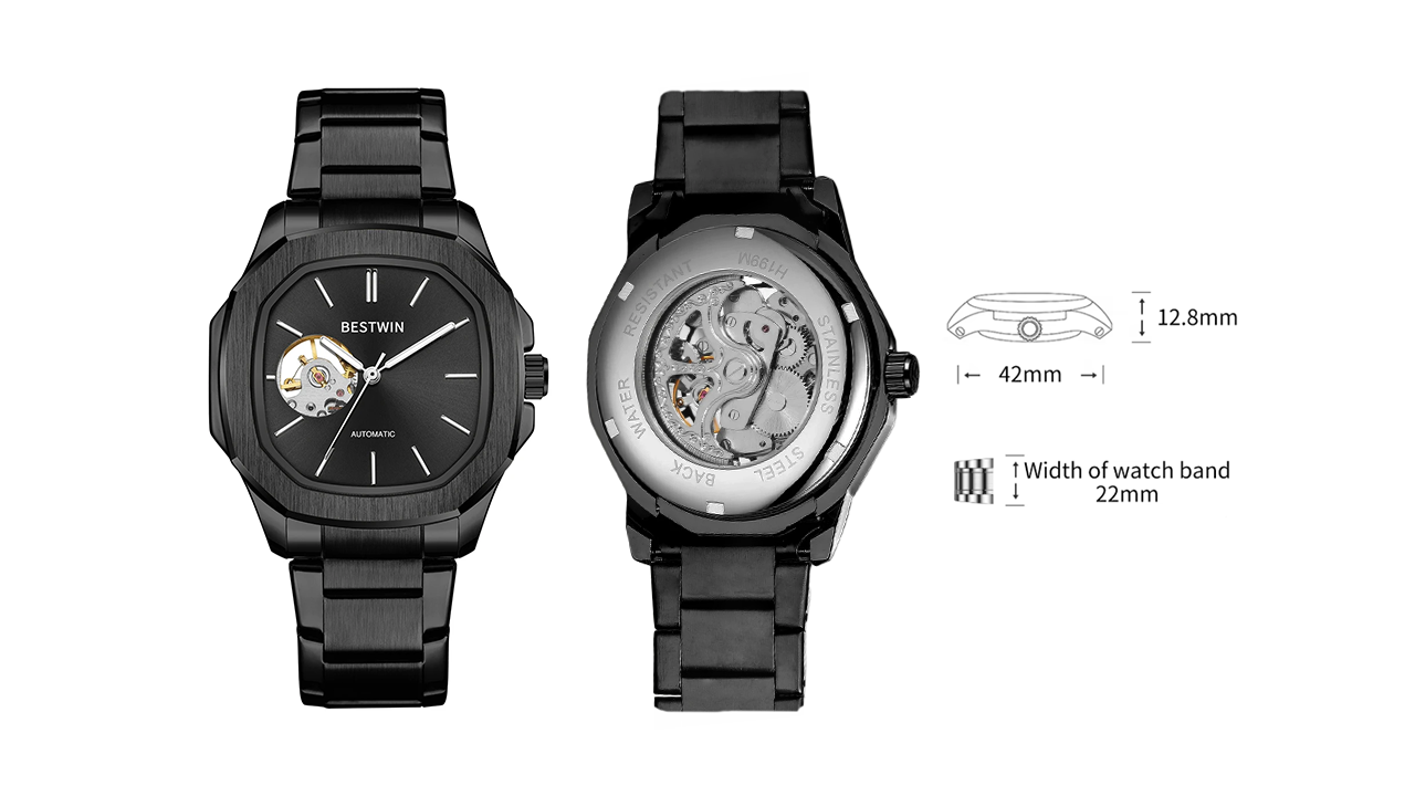 BESTWIN Black Skeleton Dial Watch – Steel Classic Edition (Model: BW-SK01-BLK)